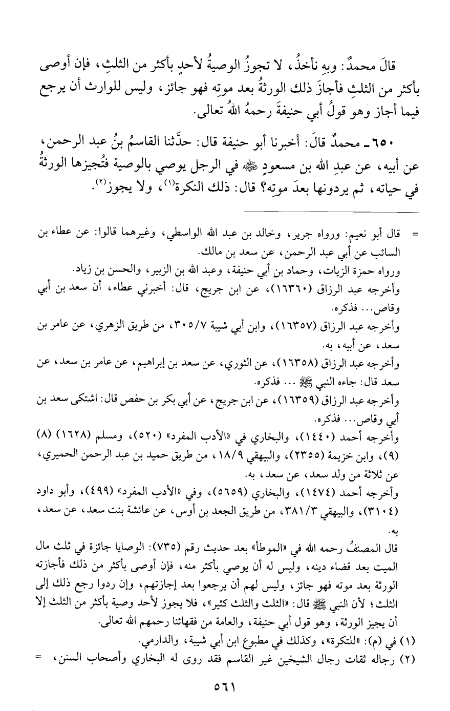 650 - محمد قال: أخبرنا أبو حنيفة قال: حدثنا القاسم بن عبد الرحمن, عن أبيه, عن عبد الله بن مسعود رضي الله عنه في الرجل يوصي بالوصية فتجيزها الورثة في حياته, ثم يردونها بعد موته؟ قال: ذلك النكرة, ولا يجوز.