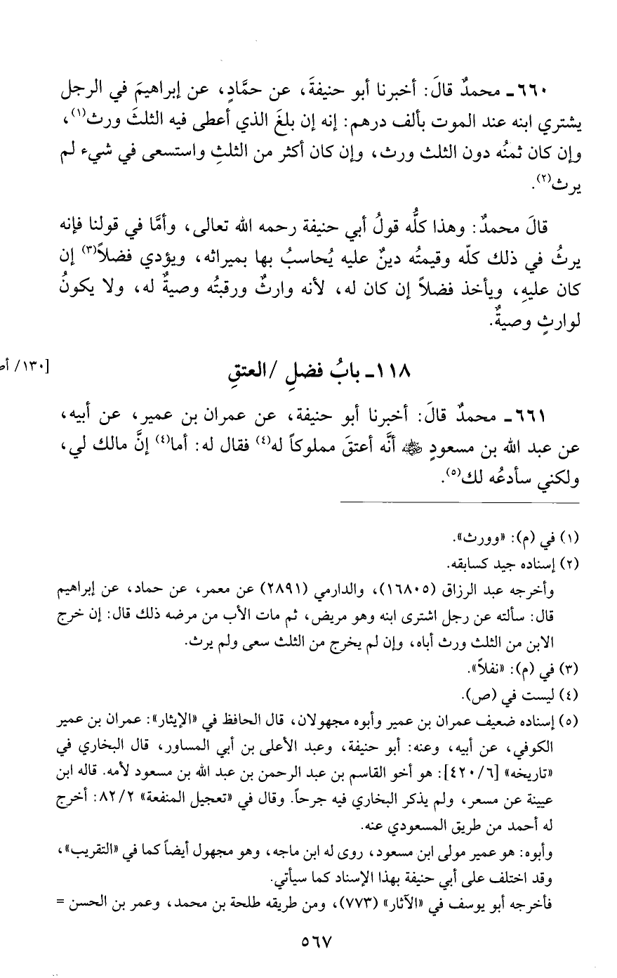 661 - محمد قال: أخبرنا أبو حنيفة, عن عمران بن عمير, عن أبيه, عن عبد الله بن مسعود رضي الله عنه أنه أعتق مملوكا له فقال له: أما إن مالك لي, ولكني سأدعه لك.