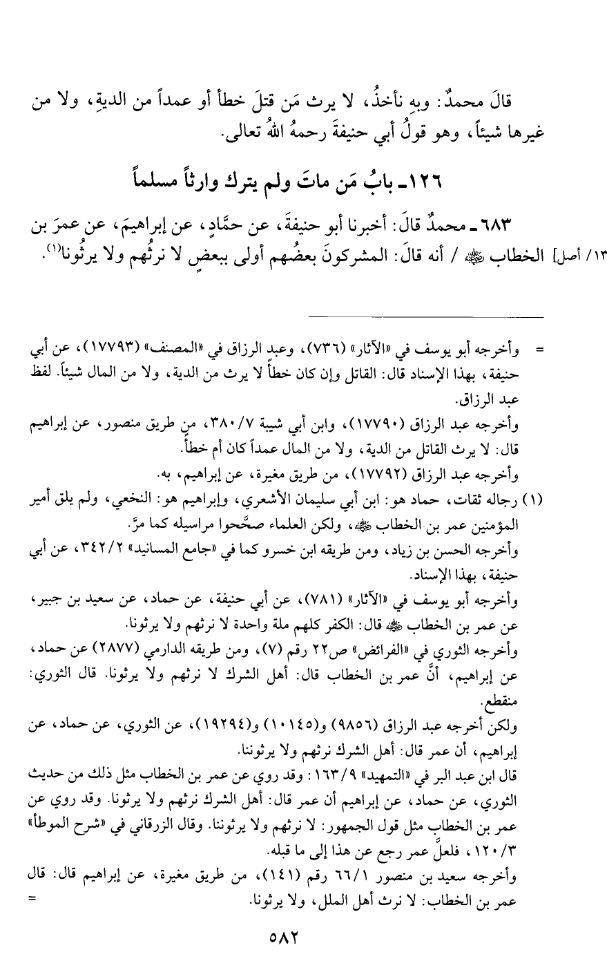 683 - محمد قال: أخبرنا أبو حنيفة, عن حماد, عن إبراهيم, عن عمر بن الخطاب رضي الله عنه أنه قال: المشركون بعضهم أولى ببعض لا نرثهم ولا يرثونا.