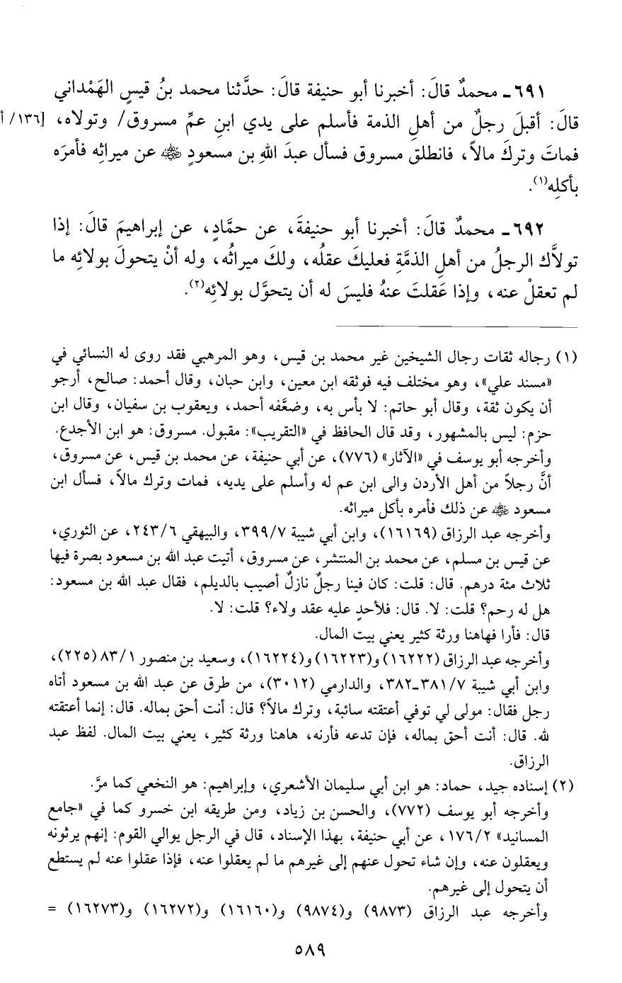 691 - محمد قال: أخبرنا أبو حنيفة قال: حدثنا محمد بن قيس الهمداني قال: أقبل رجل من أهل الذمة فأسلم على يدي ابن عم مسروق وتولاه, فمات وترك مالا, فانطلق مسروق فسأل عبد الله بن مسعود رضي الله عنه عن ميراثه فأمره بأكله.