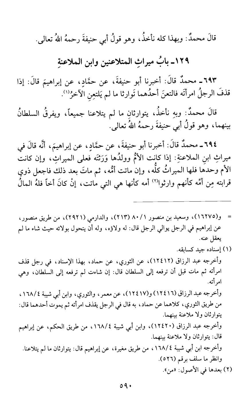693 - محمد قال: أخبرنا أبو حنيفة, عن حماد, عن إبراهيم قال: إذا قذف الرجل امرأته فالتعن أحدهما توارثا ما لم يلتعن الآخر.