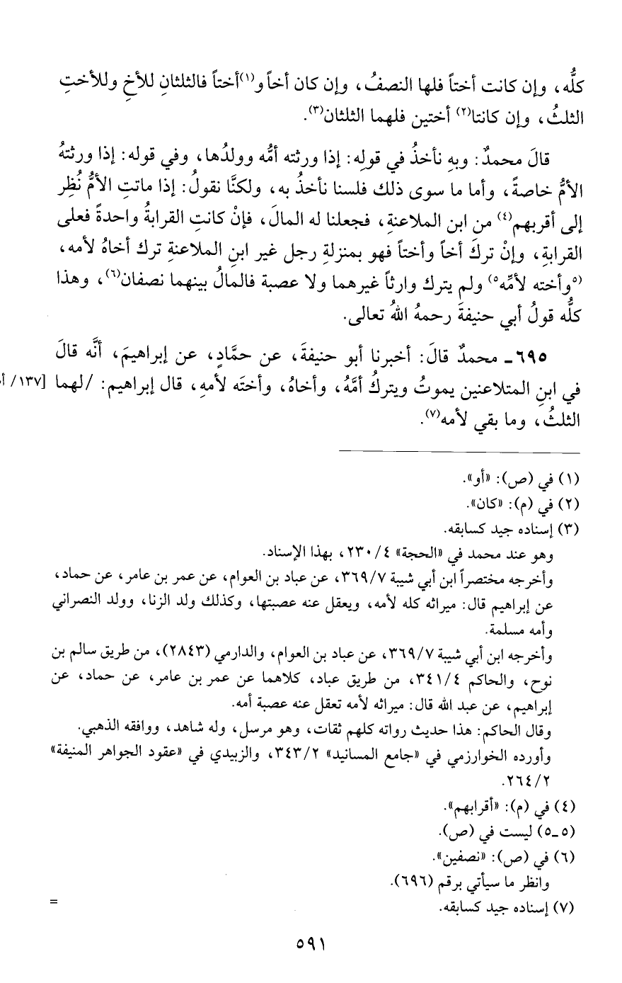 695 - محمد قال: أخبرنا أبو حنيفة, عن حماد, عن إبراهيم, أنه قال في ابن المتلاعنين يموت ويترك أمه, وأخاه, وأخته لأمه, قال إبراهيم: لهما الثلث, وما بقي لأمه.