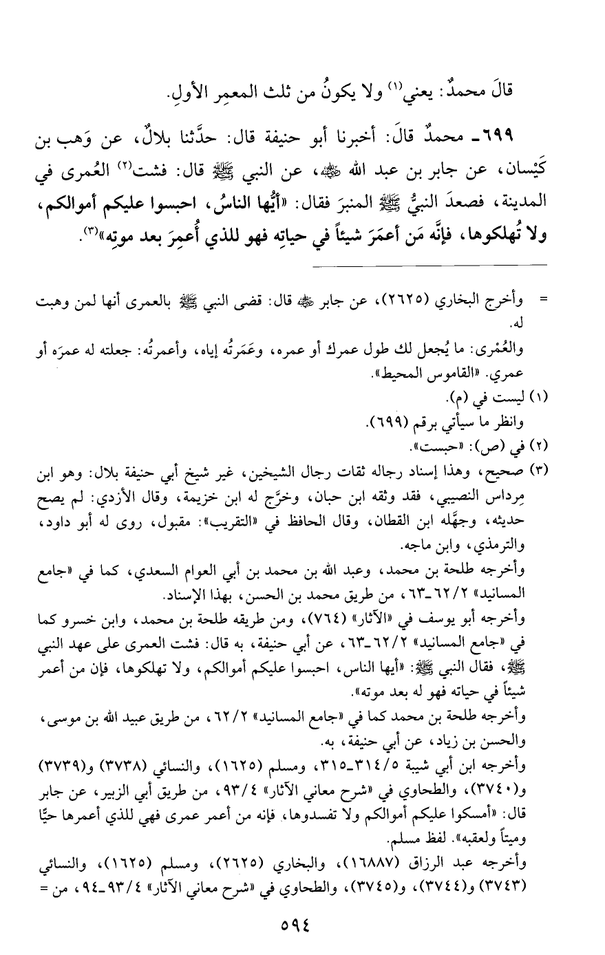 699 - محمد قال: أخبرنا أبو حنيفة قال: حدثنا بلال, عن وهب بن كيسان, عن جابر بن عبد الله رضي الله عنه, عن النبي صلى الله عليه وسلم قال: فشت العمرى في المدينة, فصعد النبي صلى الله عليه وسلم المنبر فقال: أيها الناس, احبسوا عليكم أموالكم, ولا تهلكوها, فإنه من أعمر شيئا في حياته فهو للذي أعمر بعد موته.