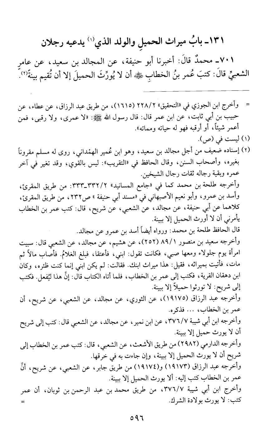 701 - محمد قال: أخبرنا أبو حنيفة, عن المجالد بن سعيد, عن عامر الشعبي قال: كتب عمر بن الخطاب رضي الله عنه أن لا يورث الحميل إلا أن تقيم بينة,