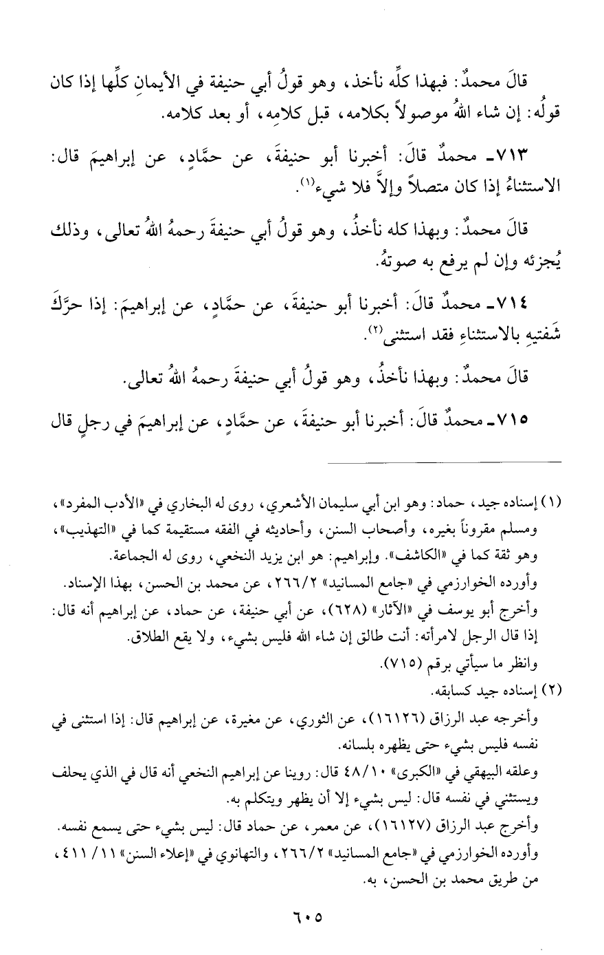 713 - محمد قال: أخبرنا أبو حنيفة, عن حماد, عن إبراهيم قال: الاستثناء إذا كان متصلا وإلا فلا شيء.