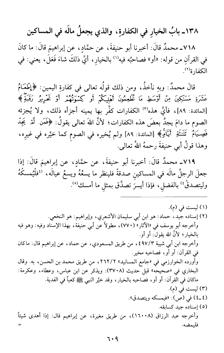 718 - محمد قال: أخبرنا أبو حنيفة, عن حماد, عن إبراهيم قال: ما كان في القرآن من قوله: أو فصاحبه فيه بالخيار, أي ذلك شاء فعل, يعني: في الكفارة.