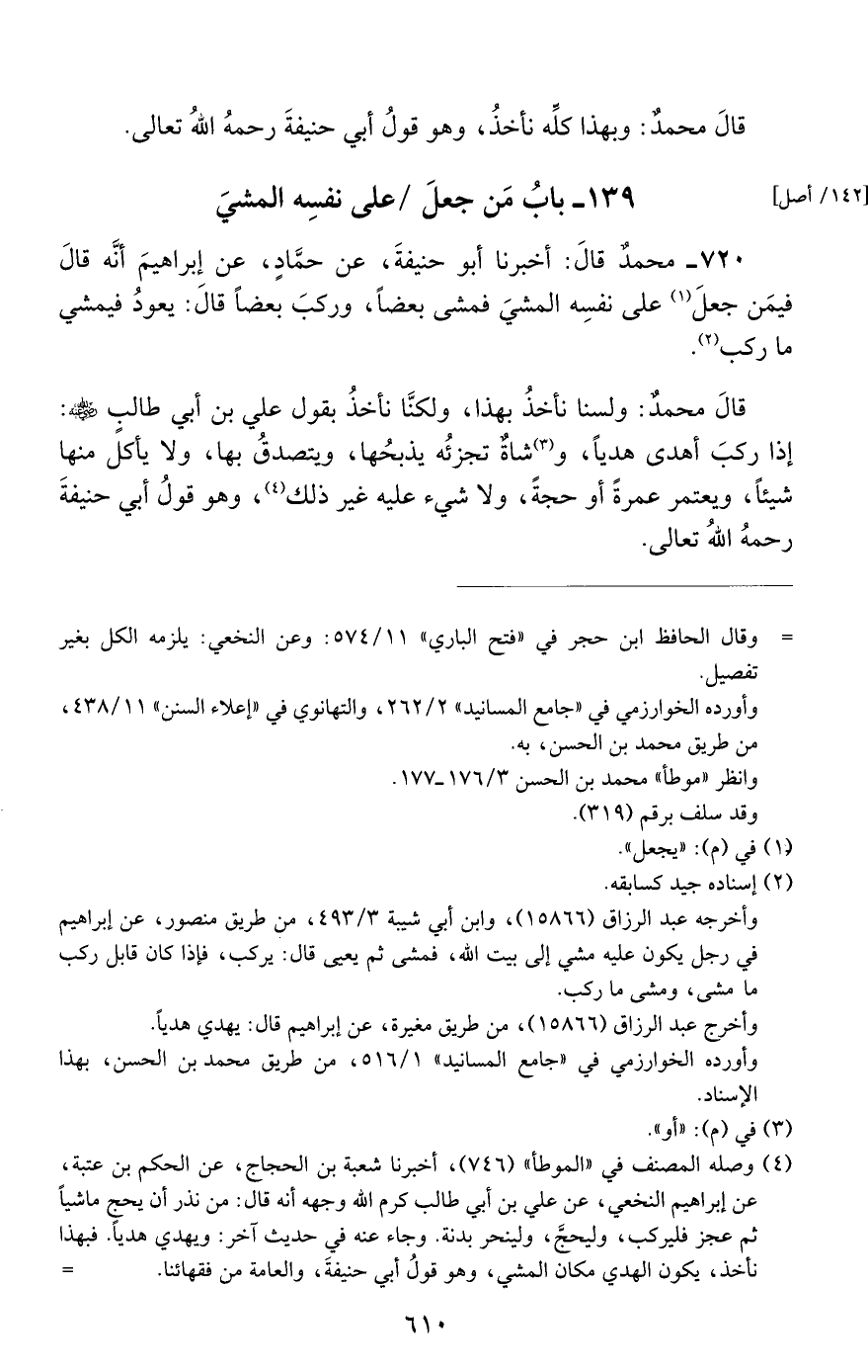 720 - محمد قال: أخبرنا أبو حنيفة, عن حماد, عن إبراهيم أنه قال فيمن جعل على نفسه المشي فمشى بعضا, وركب بعضا قال: يعود فيمشي ما ركب.