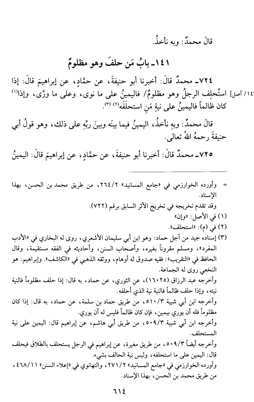 724 - محمد قال: أخبرنا أبو حنيفة, عن حماد, عن إبراهيم قال: إذا استحلف الرجل وهو مظلوم فاليمين على ما نوى, وعلى ما ورَّى, وإذا كان ظالما فاليمين على نية من استحلفه.