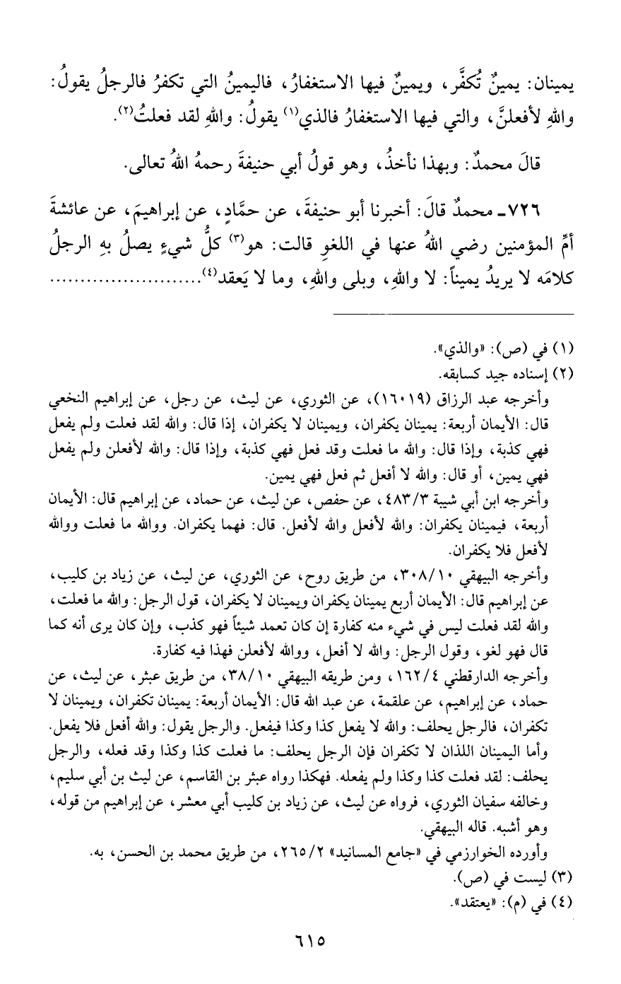 726 - محمد قال: أخبرنا أبو حنيفة, عن حماد, عن إبراهيم, عن عائشة أم المؤمنين رضي الله عنها في اللغو قالت: هو كل شيء يصل به الرجل كلامه لا يريد يمينا: لا والله, وبلى والله, وما لا يعقد #616# عليه قلبه.