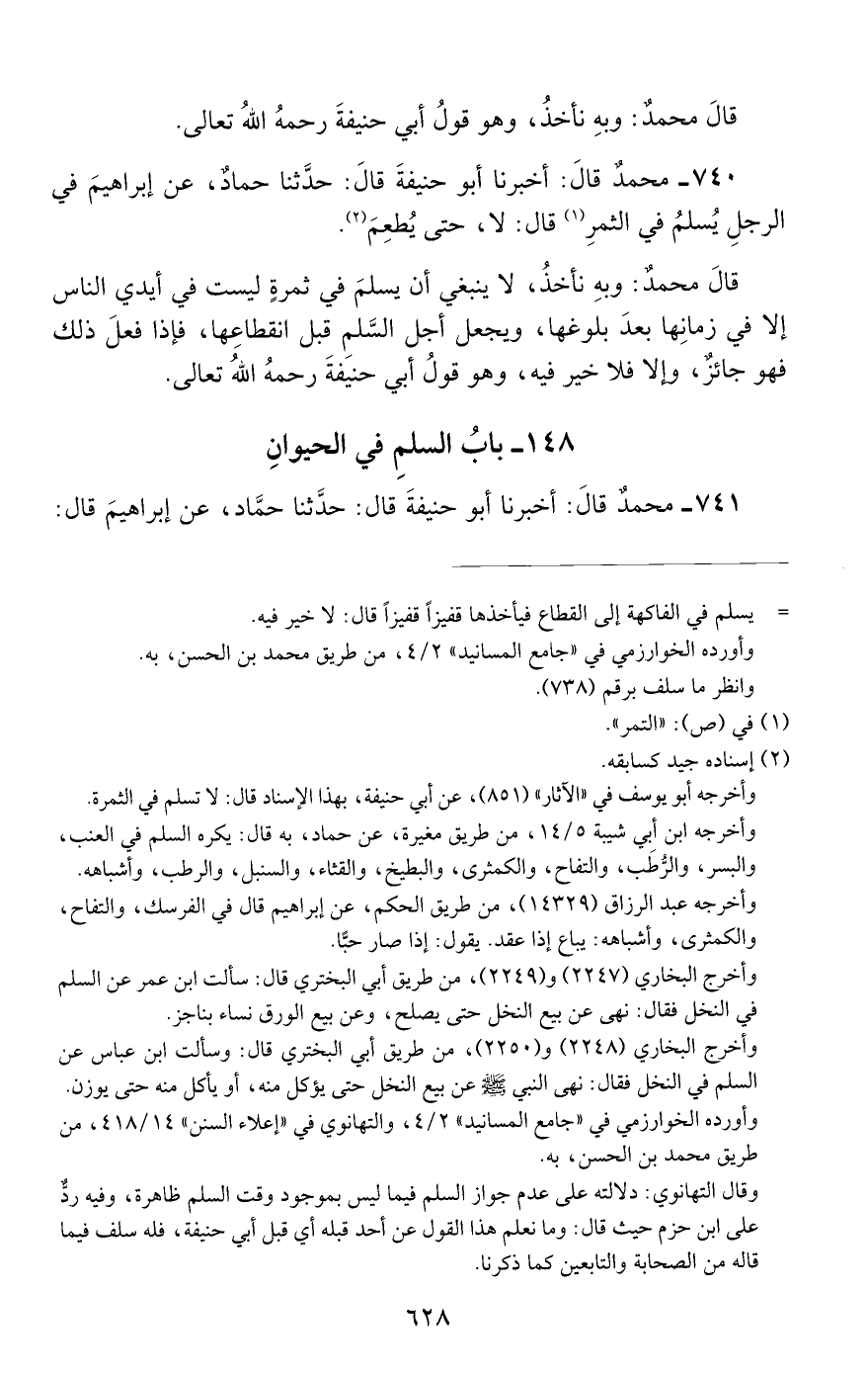 740 - محمد قال: أخبرنا أبو حنيفة قال: حدثنا حماد, عن إبراهيم في الرجل يسلم في الثمر قال: لا, حتى يطعم.