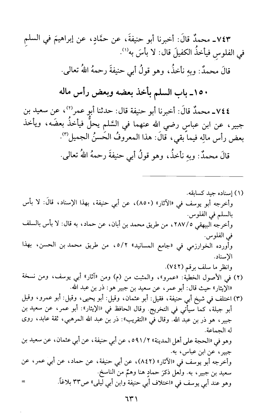 744 - محمد قال: أخبرنا أبو حنيفة قال: حدثنا أبو عمر, عن سعيد بن جبير, عن ابن عباس رضي الله عنهما في السلم يحل فيأخذ بعضه, ويأخذ بعض رأس ماله فيما بقي, قال: هذا المعروف الحسن الجميل.