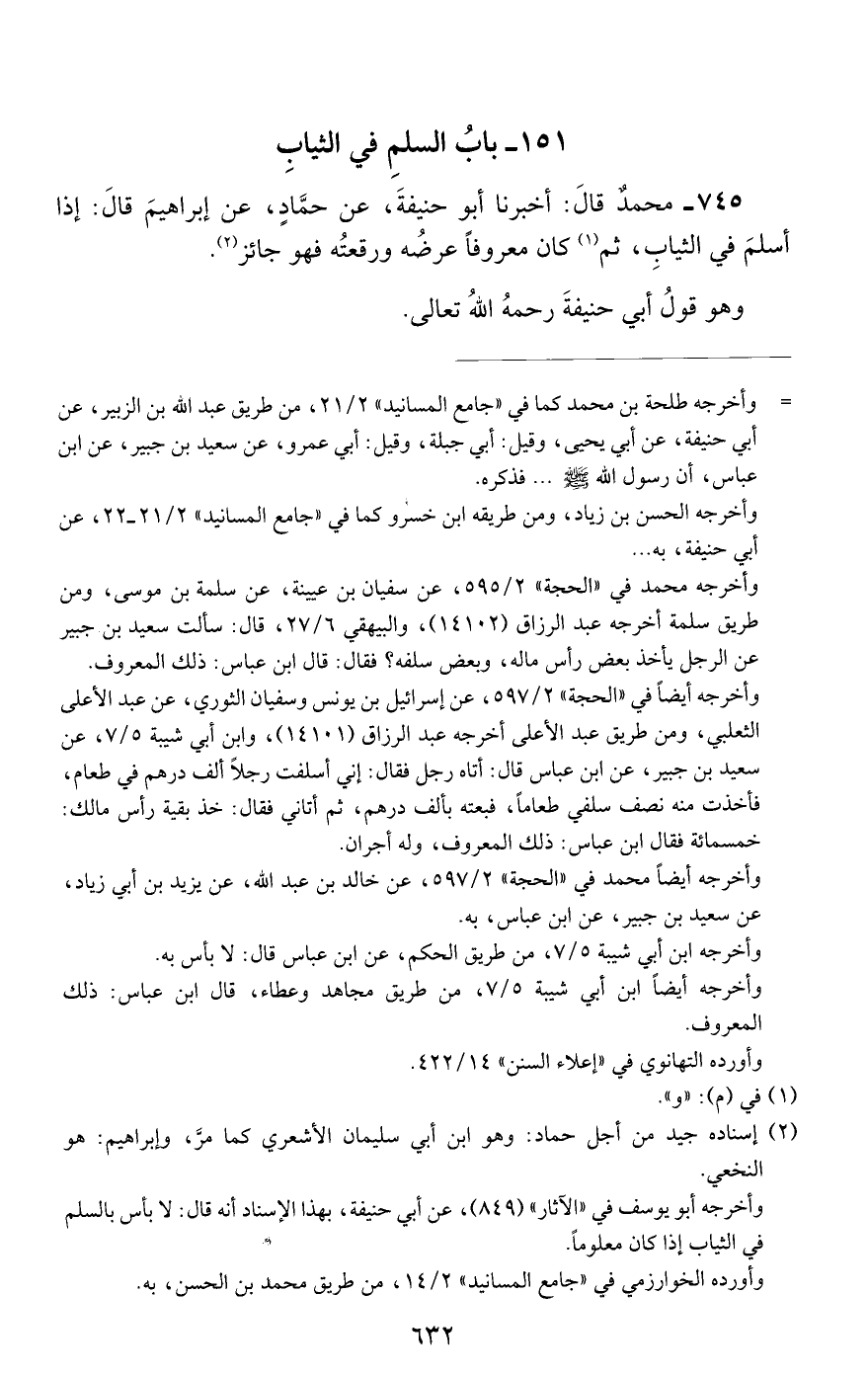 745 - محمد قال: أخبرنا أبو حنيفة, عن حماد, عن إبراهيم قال: إذا أسلم في الثياب, ثم كان معروفا عرضه ورقعته فهو جائز.