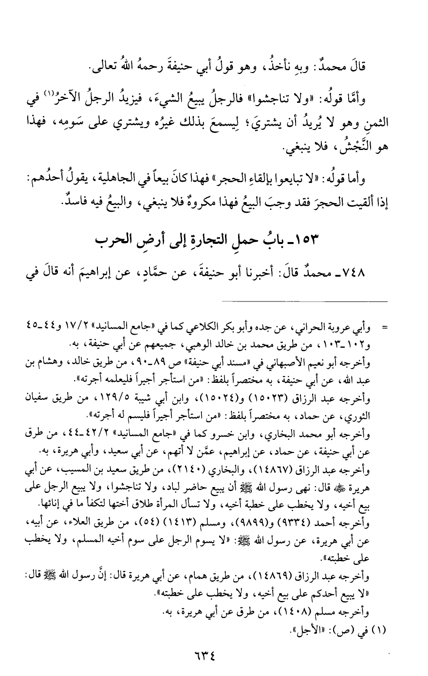 748 - محمد قال: أخبرنا أبو حنيفة, عن حماد, عن إبراهيم أنه قال في #635# التاجر يختلف إلى أرض الحرب: إنه لا بأس بذلك ما لم يحمل إليهم سلاحا, أو كراعا, أو سلبا.