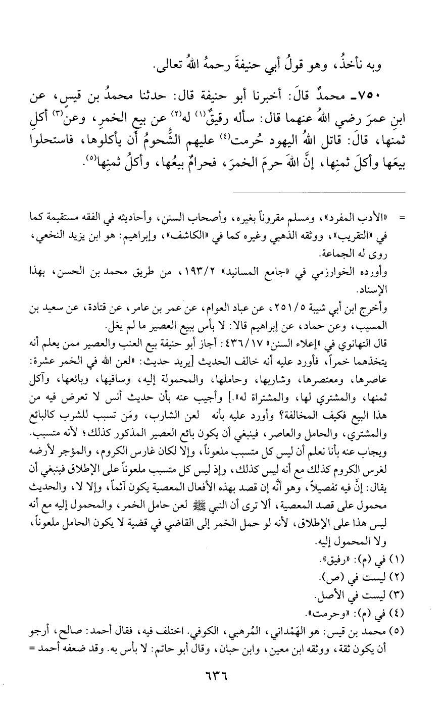 750 - محمد قال: أخبرنا أبو حنيفة قال: حدثنا محمد بن قيس, عن ابن عمر رضي الله عنهما قال: سأله رقيق له عن بيع الخمر, وعن أكل ثمنها, قال: قاتل الله اليهود حرمت عليهم الشحوم أن يأكلوها, فاستحلوا بيعها وأكل ثمنها, إن الله حرم الخمر, فحرام بيعها, وأكل ثمنها.