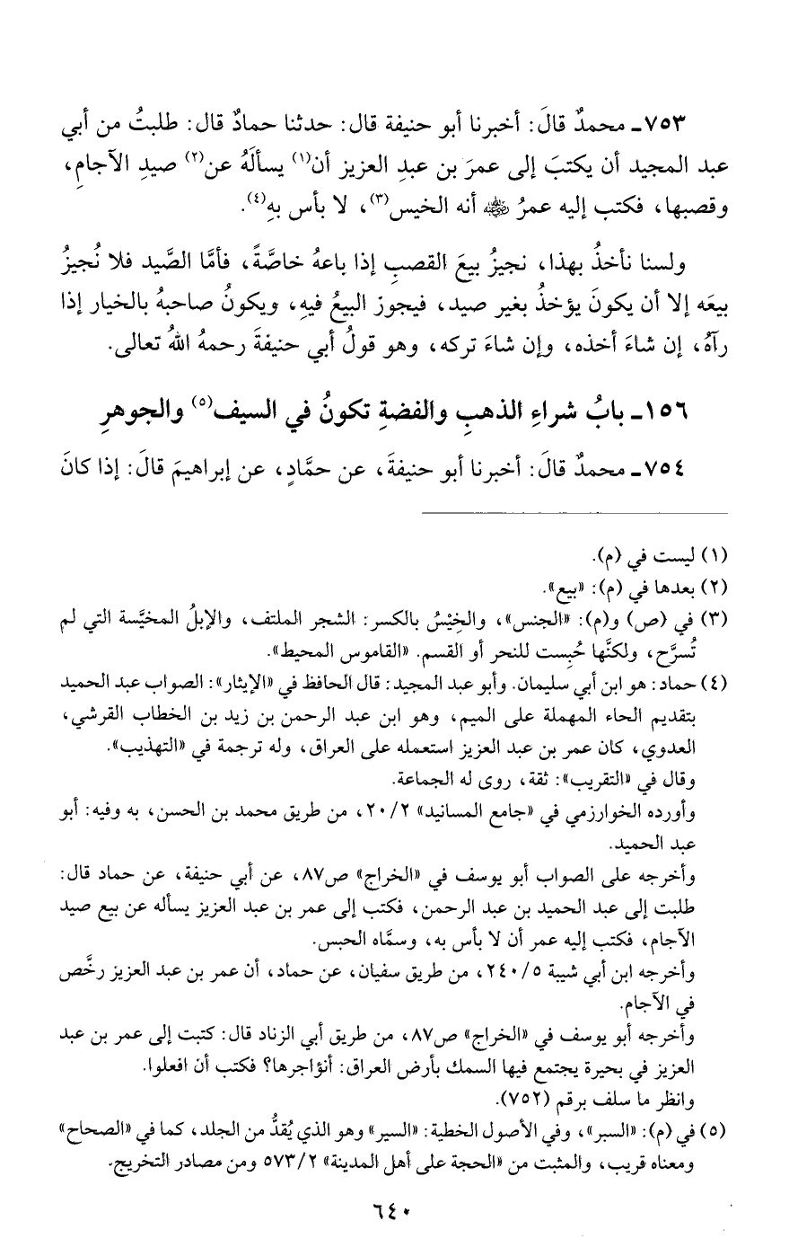753 - محمد قال: أخبرنا أبو حنيفة قال: حدثنا حماد قال: طلبت من أبي عبد المجيد أن يكتب إلى عمر بن عبد العزيز أن يسأله عن صيد الآجام, وقصبها, فكتب إليه عمر رضي الله عنه أنه الخيس, لا بأس به.