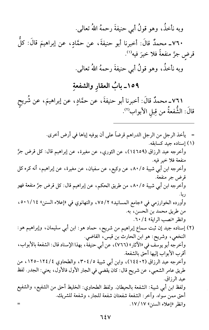 760 - محمد قال: أخبرنا أبو حنيفة, عن حماد, عن إبراهيم قال: كل قرض جر منفعة فلا خير فيه.