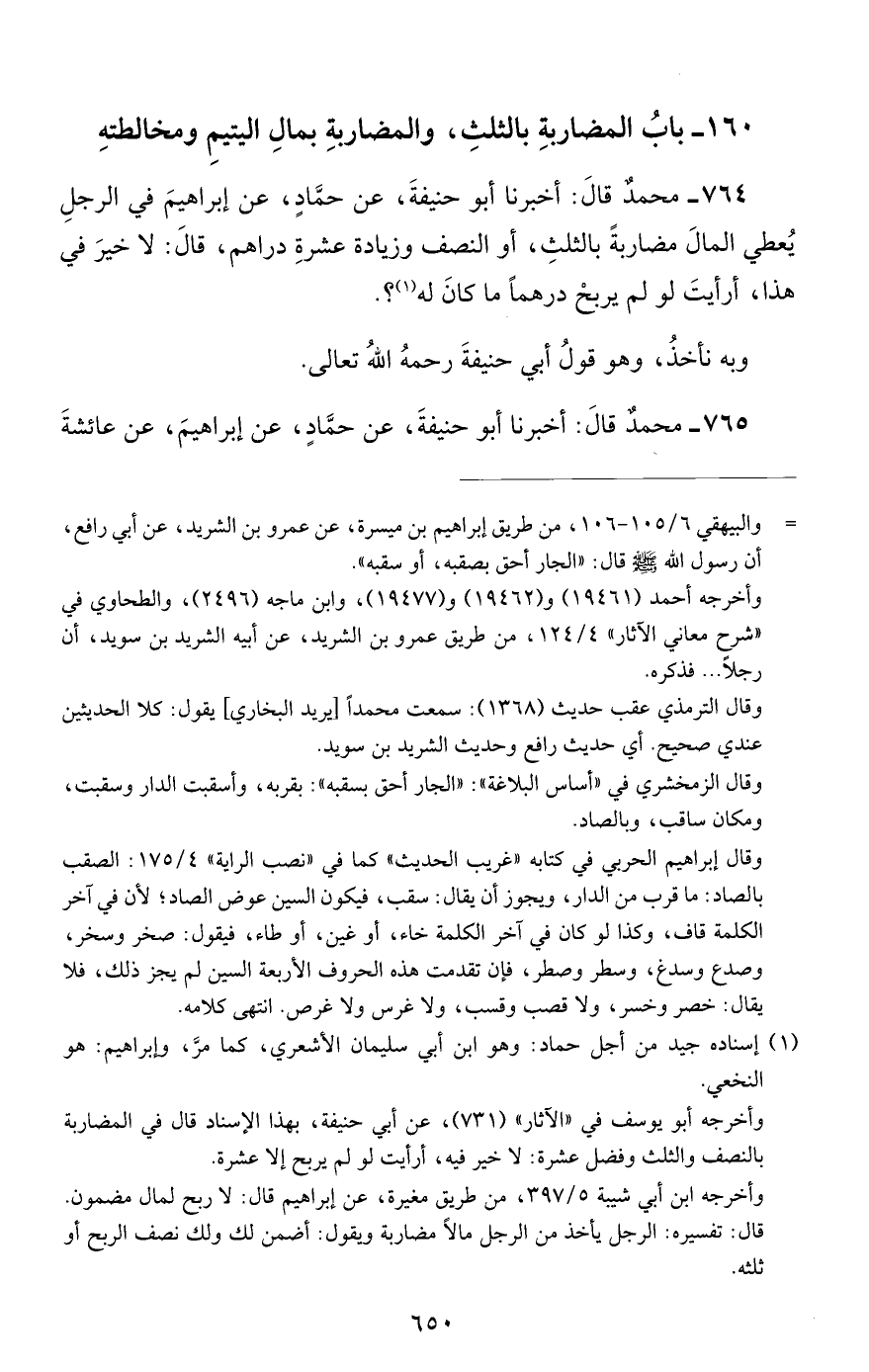 764 - محمد قال: أخبرنا أبو حنيفة, عن حماد, عن إبراهيم في الرجل يعطي المال مضاربة بالثلث, أو النصف وزيادة عشرة دراهم, قال: لا خير في هذا, أرأيت لو لم يربح درهما ما كان له؟.