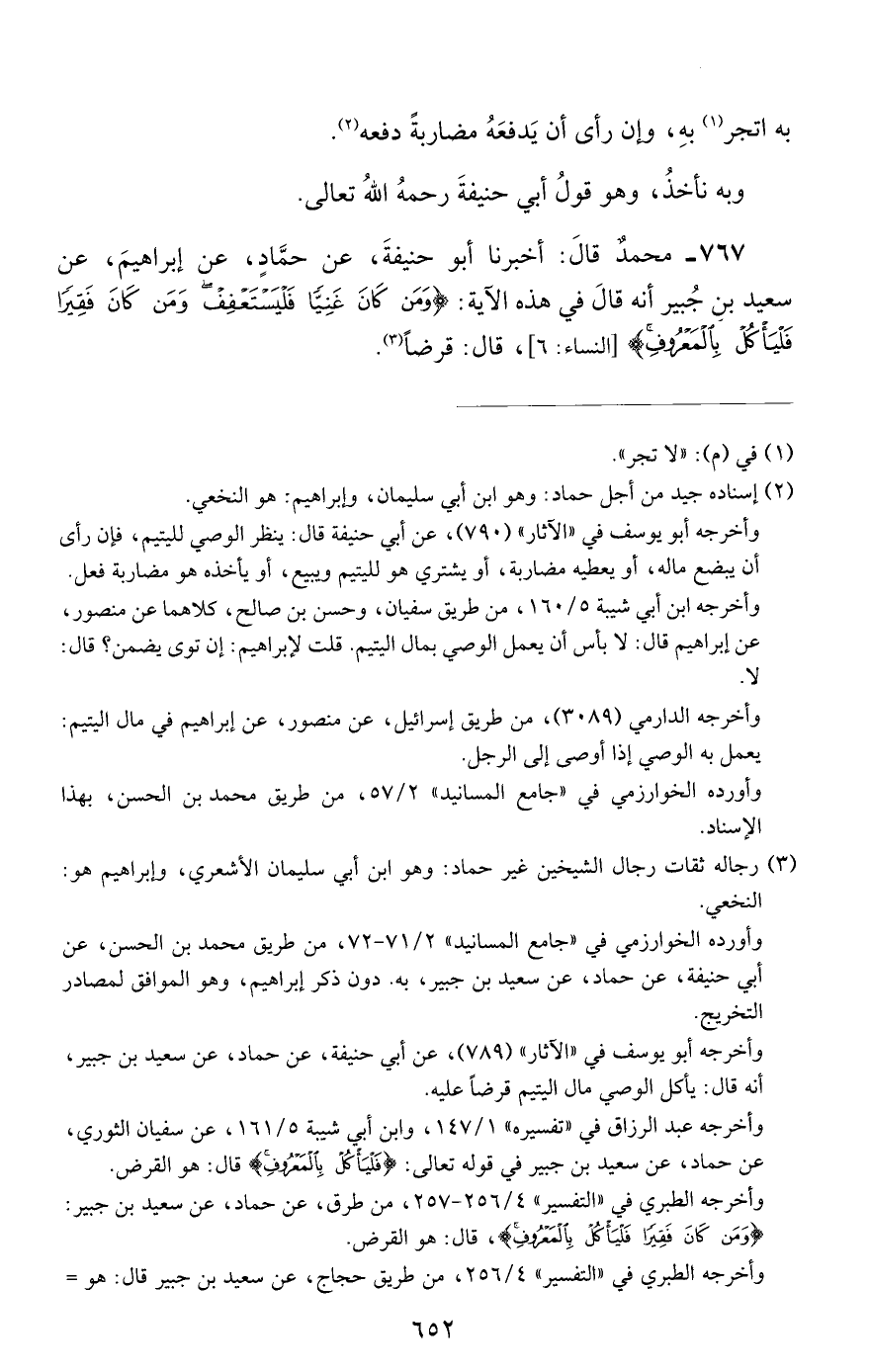 767 - محمد قال: أخبرنا أبو حنيفة, عن حماد, عن إبراهيم, عن سعيد بن جبير أنه قال في هذه الآية: {ومن كان غنيا فليستعفف ومن كان فقيرا فليأكل بالمعروف} , قال: قرضا.