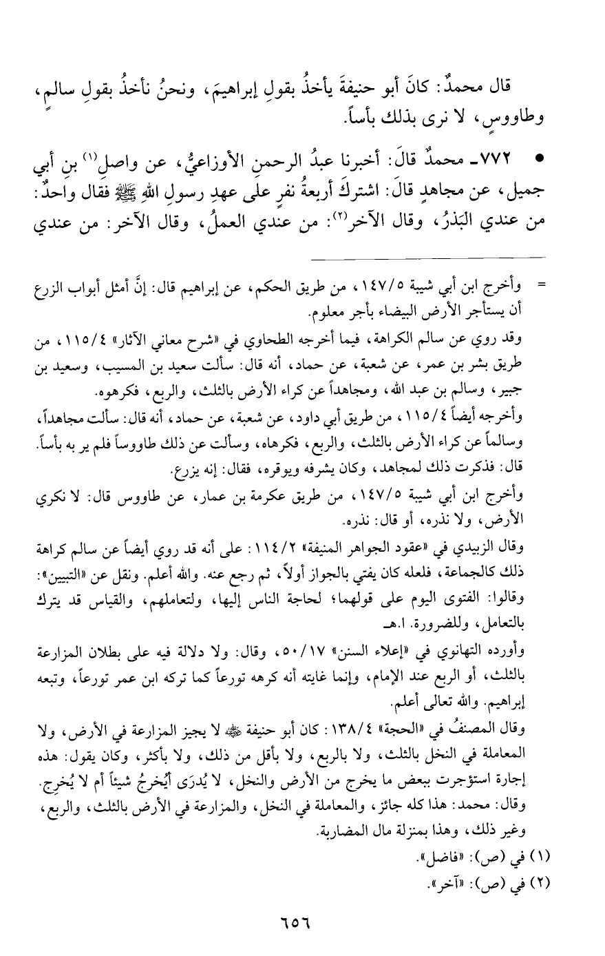 772 - محمد قال: أخبرنا عبد الرحمن الأوزاعي, عن واصل بن أبي جميل, عن مجاهد قال: اشترك أربعة نفر على عهد رسول الله صلى الله عليه وسلم فقال واحد: من عندي البذر, وقال الآخر: من عندي العمل, وقال الآخر: من عندي #657# الفدان, وقال الآخر: من عندي الأرض. قال: فألغى رسول الله صلى الله عليه وسلم صاحب الأرض, وجعل لصاحب الفدان أجرا مسمى, وجعل لصاحب العمل درهما لكل يوم, وألحق الزرع كله بصاحب البذر.