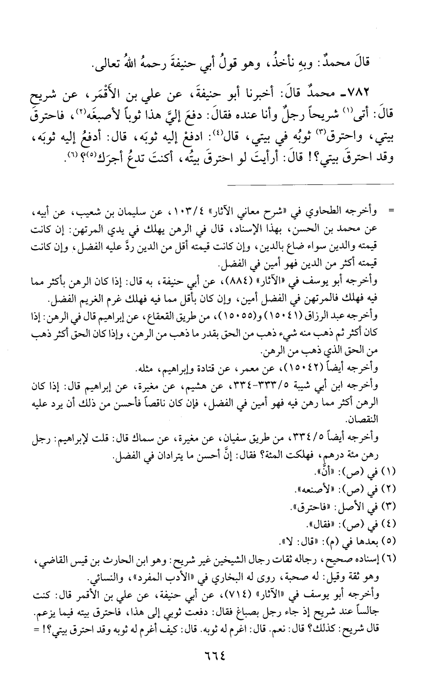 782 - محمد قال: أخبرنا أبو حنيفة, عن علي بن الأقمر, عن شريح قال: أتى شريحا رجل وأنا عنده فقال: دفع إلي هذا ثوبا لأصبغه, فاحترق بيتي, واحترق ثوبه في بيتي, قال: ادفع إليه ثوبه, قال: أدفع إليه ثوبه, وقد احترق بيتي؟! قال: أرأيت لو احترق بيته, أكنت تدع أجرك؟.