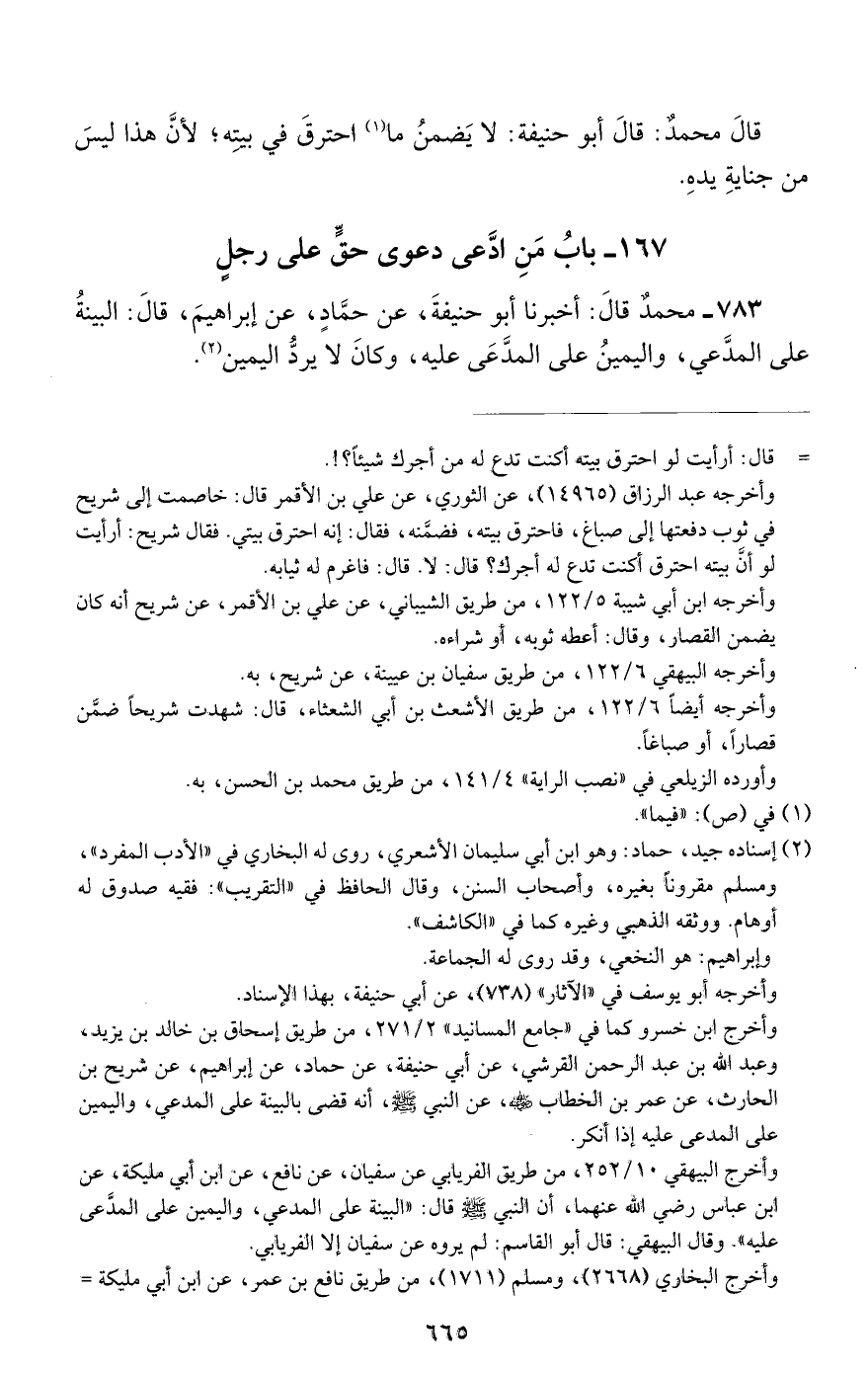 783 - محمد قال: أخبرنا أبو حنيفة, عن حماد, عن إبراهيم, قال: البينة على المدعي, واليمين على المدعي عليه, وكان لا يرد اليمين.