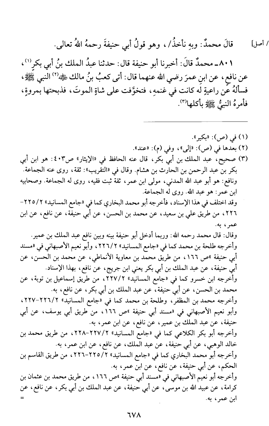 801 - محمد قال: أخبرنا أبو حنيفة قال: حدثنا عبد الملك بن أبي بكر, عن نافع, عن ابن عمر رضي الله عنهما قال: أتى كعب بن مالك رضي الله عنه النبي صلى الله عليه وسلم, فسأله عن راعية له كانت في غنمه, فتخوفت على شاة الموت, فذبحتها بمروة, فأمره النبي صلى الله عليه وسلم بأكلها.