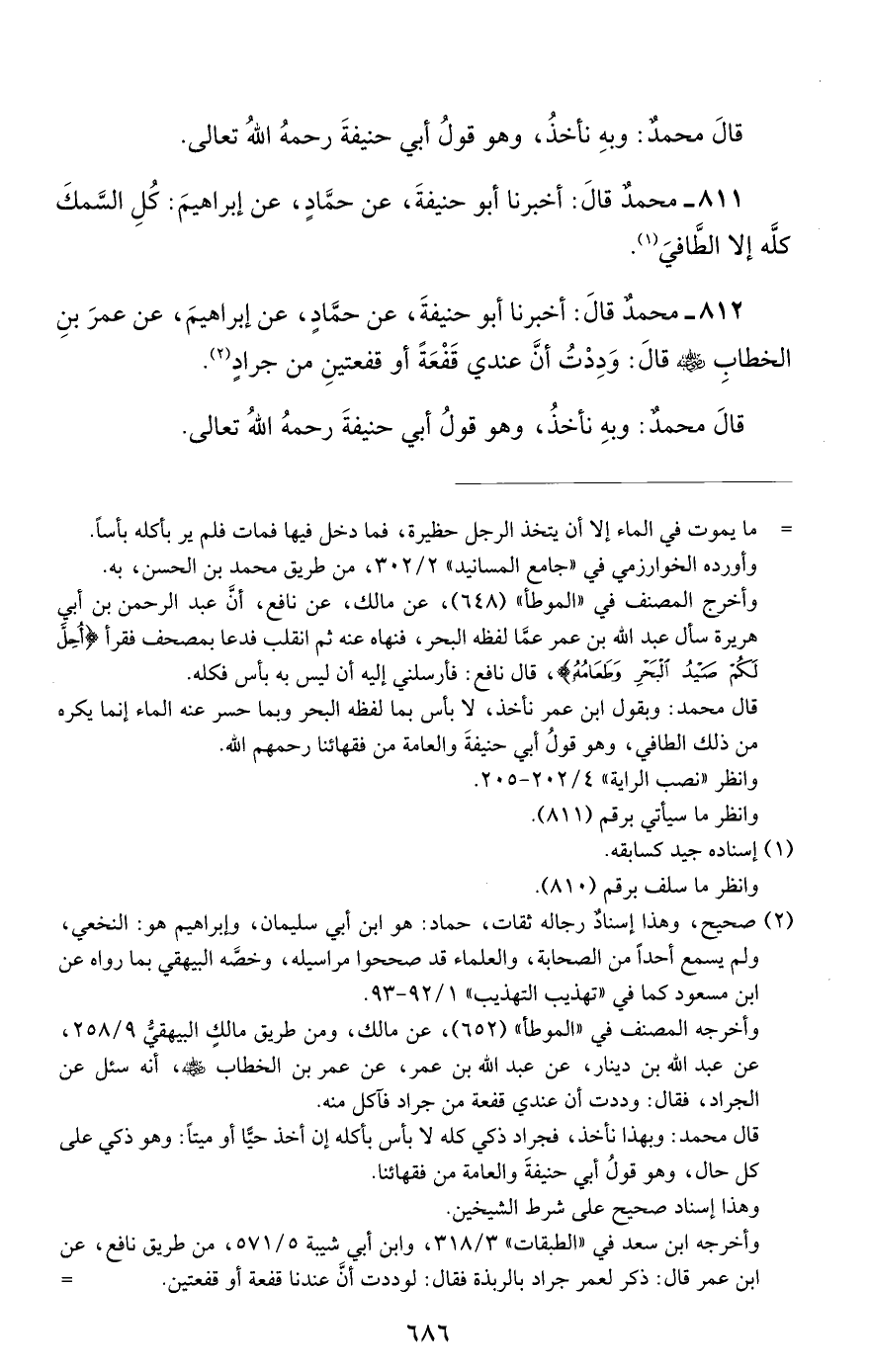 811 - محمد قال: أخبرنا أبو حنيفة, عن حماد, عن إبراهيم: كل السمك كله إلا الطافي.