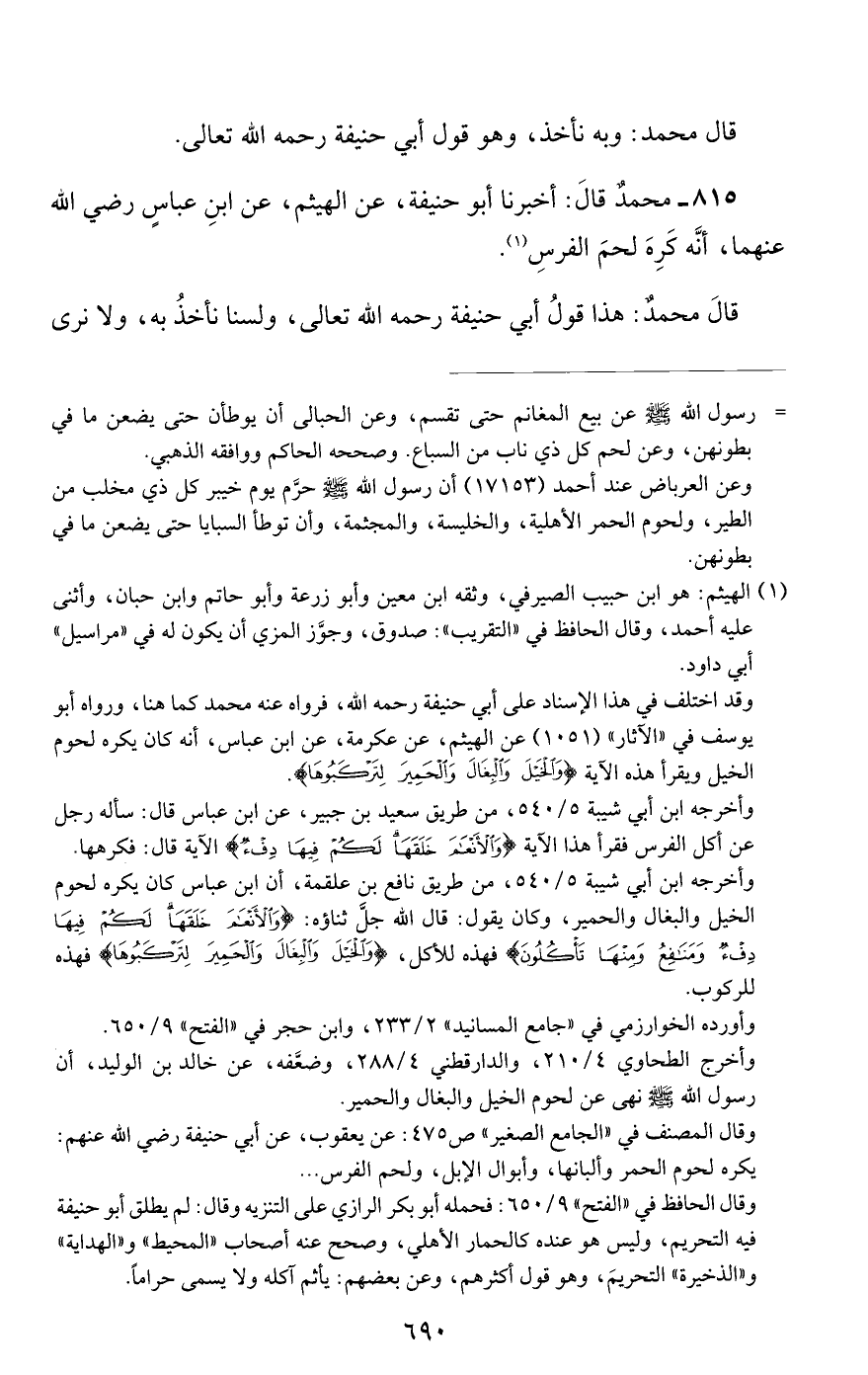 815 - محمد قال: أخبرنا أبو حنيفة, عن الهيثم, عن ابن عباس رضي الله عنهما, أنه كره لحم الفرس.