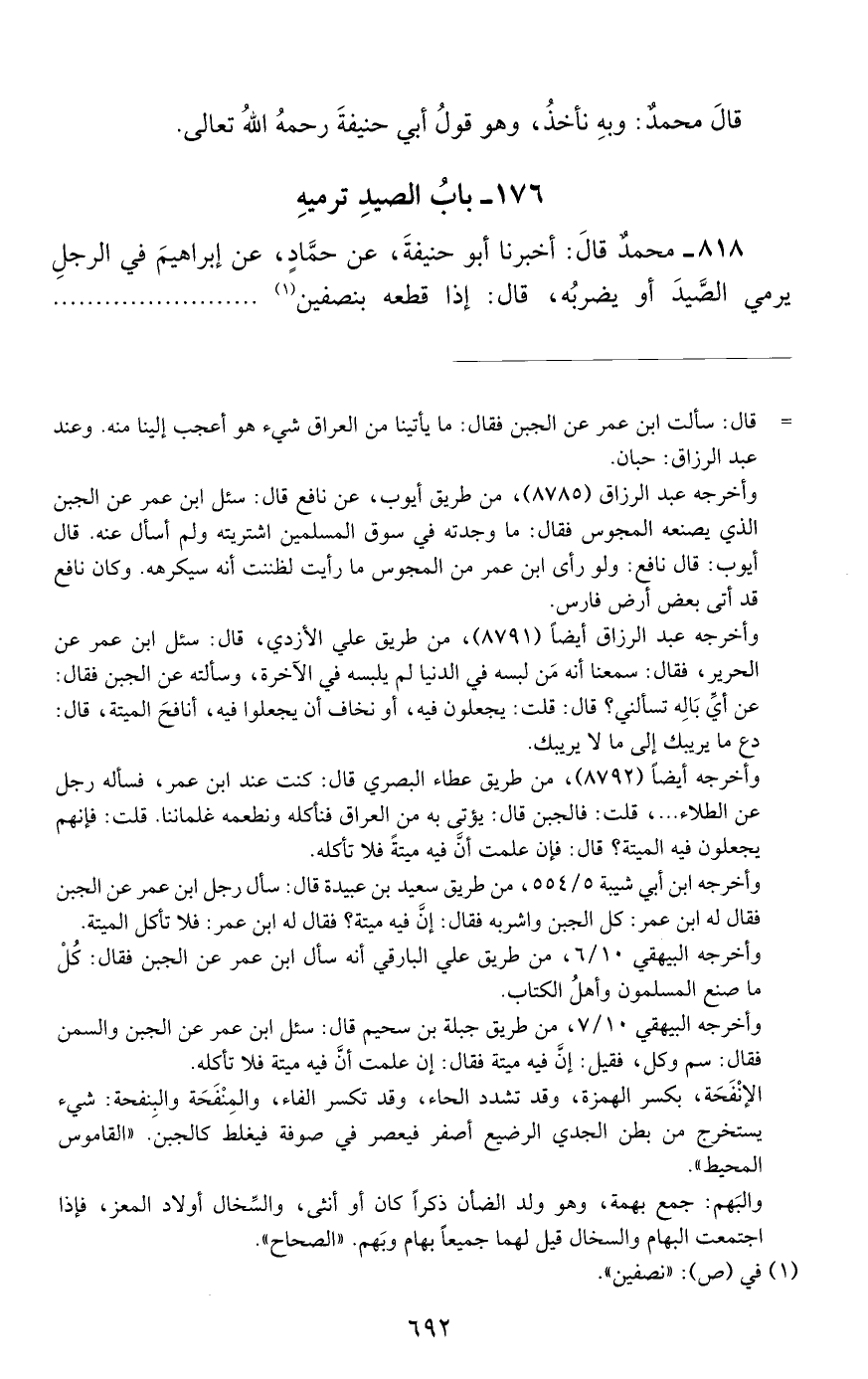 818 - محمد قال: أخبرنا أبو حنيفة, عن حماد, عن إبراهيم في الرجل يرمي الصيد أو يضربه, قال: إذا قطعه بنصفين #693# فكلهما جميعا, وإن كان مما يلي الرأس أقل فكلهما جميعا, وإن كان مما يلي الرأس أكثر فكل مما يلي الرأس وألق ما بقي منه مما يلي العجز, فإن قطعت منه قطعة أو عضوا فبانت, فلا تأكلها إلا أن يكون معلقا, فإن كان معلقا فكل.