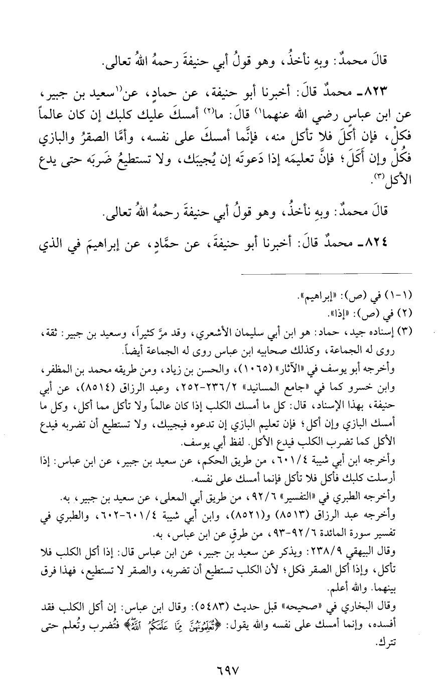 823 - محمد قال: أخبرنا أبو حنيفة, عن حماد, عن سعيد بن جبير, عن ابن عباس رضي الله عنهما قال: ما أمسك عليك كلبك إن كان عالما فكل, فإن أكل فلا تأكل منه, فإنما أمسك على نفسه, وأما الصقر والبازي فكل وإن أكل؛ فإن تعليمه إذا دعوته إن يجيبك, ولا تستطيع ضربه حتى يدع الأكل.