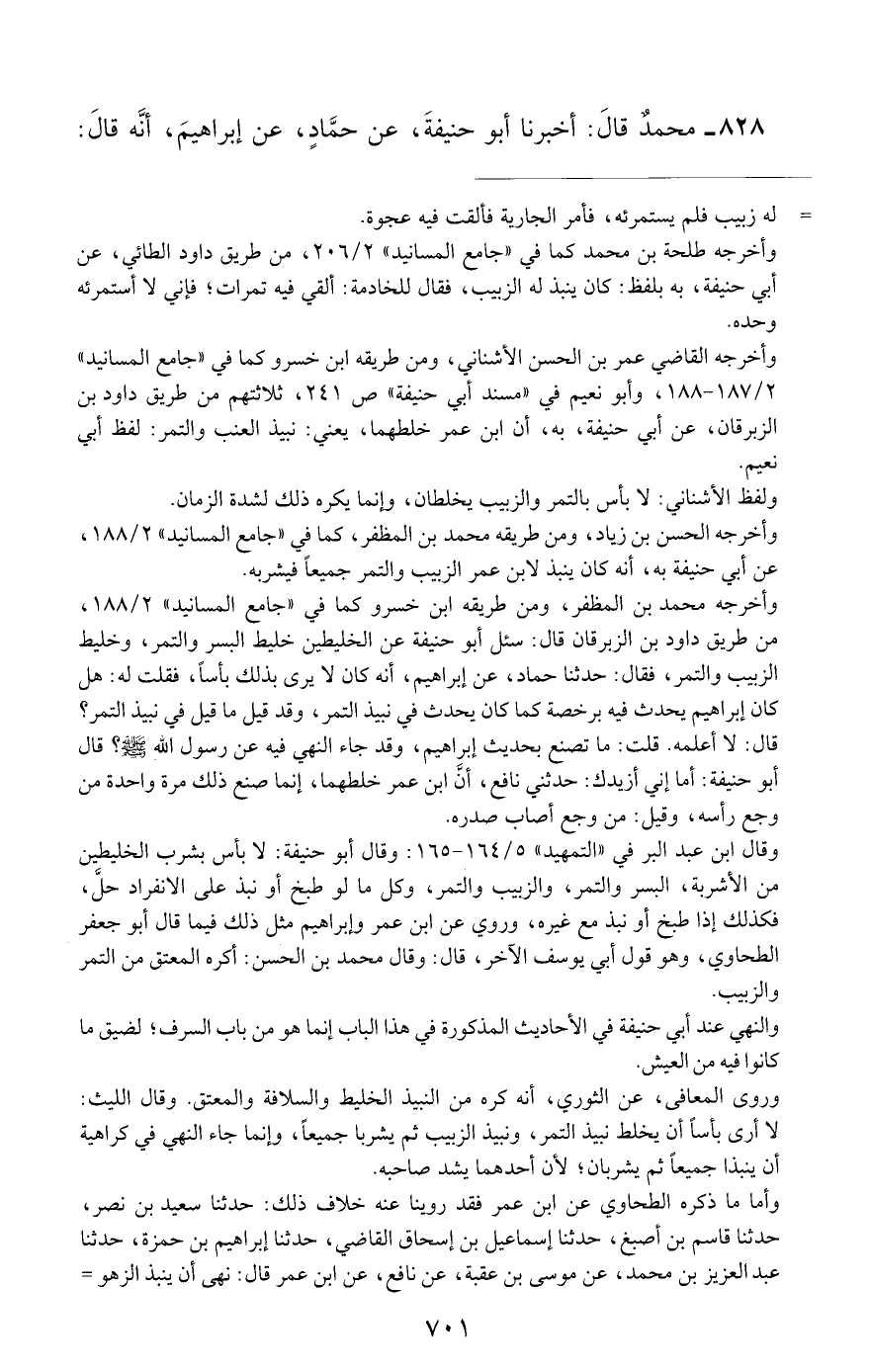 828 - محمد قال: أخبرنا أبو حنيفة, عن حماد, عن إبراهيم, أنه قال: #702# لا بأس بشرب نبيد التمر والزبيب إذا خلطا, فإنهما إنما كرها لشدة العيش في الزمن الأول, كما كره السمن واللحم, فأما إذا وسع الله تعالى على المسلمين فلا بأس بهما.