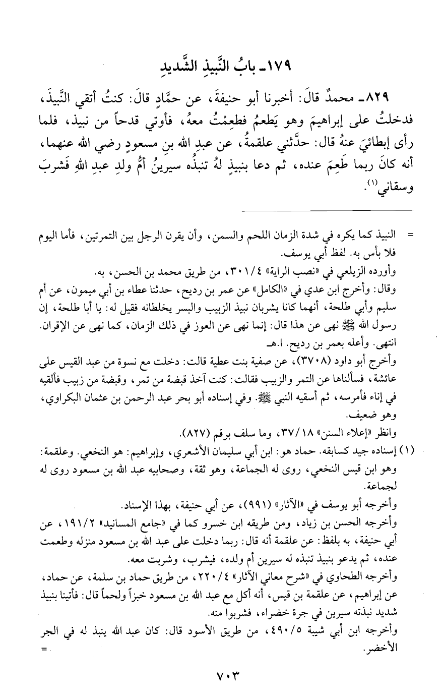 829 - محمد قال: أخبرنا أبو حنيفة, عن حماد قال: كنت أتقي النبيذ, فدخلت على إبراهيم وهو يطعم فطعمت معه, فأوتي قدحا من نبيذ, فلما رأى إبطائي عنه قال: حدثني علقمة, عن عبد الله بن مسعود رضي الله عنهما, أنه كان ربما طعم عنده, ثم دعا بنبيذ له تنبذه سيرين أم ولد عبد الله فشرب وسقاني.