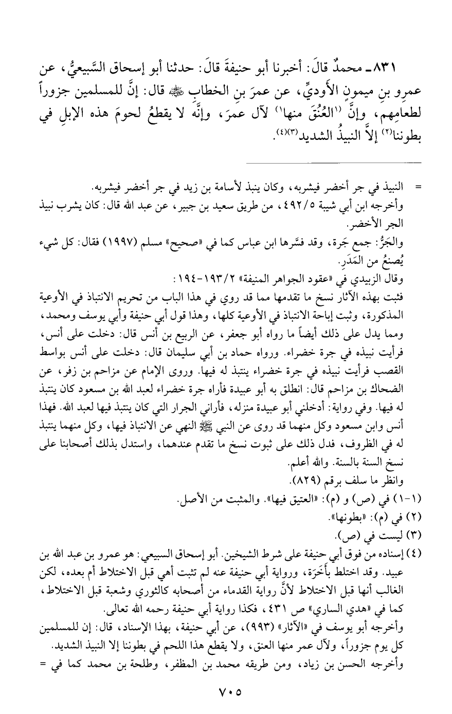 831 - محمد قال: أخبرنا أبو حنيفة قال: حدثنا أبو إسحاق السبيعي, عن عمرو بن ميمون الأودي, عن عمر بن الخطاب رضي الله عنه قال: إن للمسلمين جزورا لطعامهم, وإن العنق منها لآل عمر, وإنه لا يقطع لحوم هذه الإبل في بطوننا إلا النبيذ الشديد.