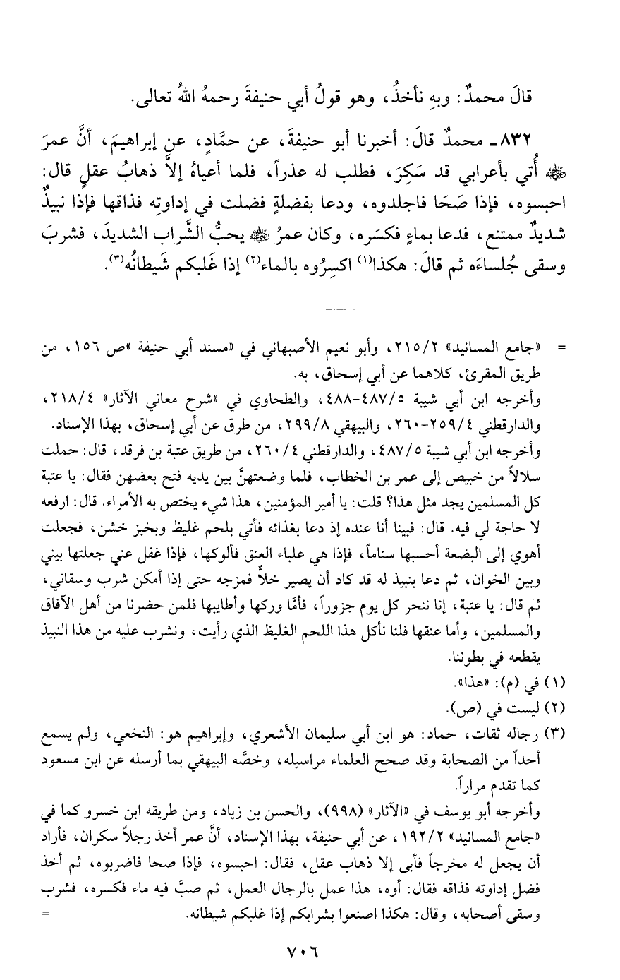 832 - محمد قال: أخبرنا أبو حنيفة, عن حماد, عن إبراهيم, أن عمر رضي الله عنه أتي بأعرابي قد سكر, فطلب له عذرا, فلما أعياه إلا ذهاب عقل قال: احبسوه, فإذا صحا فاجلدوه, ودعا بفضلة فضلت في إداوته فذاقها فإذا نبيذ شديد ممتنع, فدعا بماء فكسره, وكان عمر رضي الله عنه يحب الشراب الشديد, فشرب وسقى جلساءه ثم قال: هكذا اكسروه بالماء إذا غلبكم شيطانه.