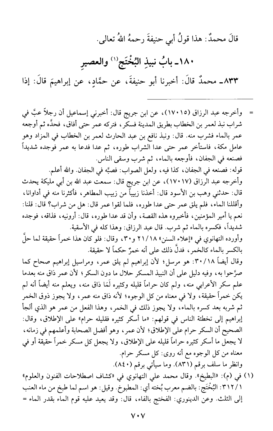 833 - محمد قال: أخبرنا أبو حنيفة, عن حماد, عن إبراهيم قال: إذا #708# طبخ العصير فذهب ثلثاه وبقي ثلثه قبل أن يغلي فلا بأس به
