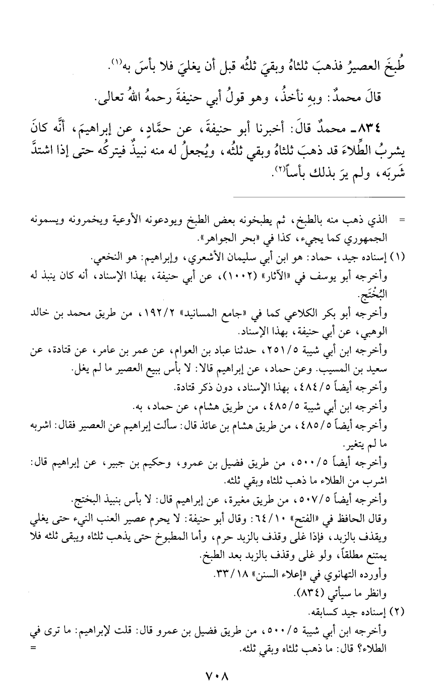 834 - محمد قال: أخبرنا أبو حنيفة, عن حماد, عن إبراهيم, أنه كان يشرب الطلاء قد ذهب ثلثاه وبقي ثلثه, ويجعل له منه نبيذ فيتركه حتى إذا اشتد شربه, ولم ير بذلك بأسا.
