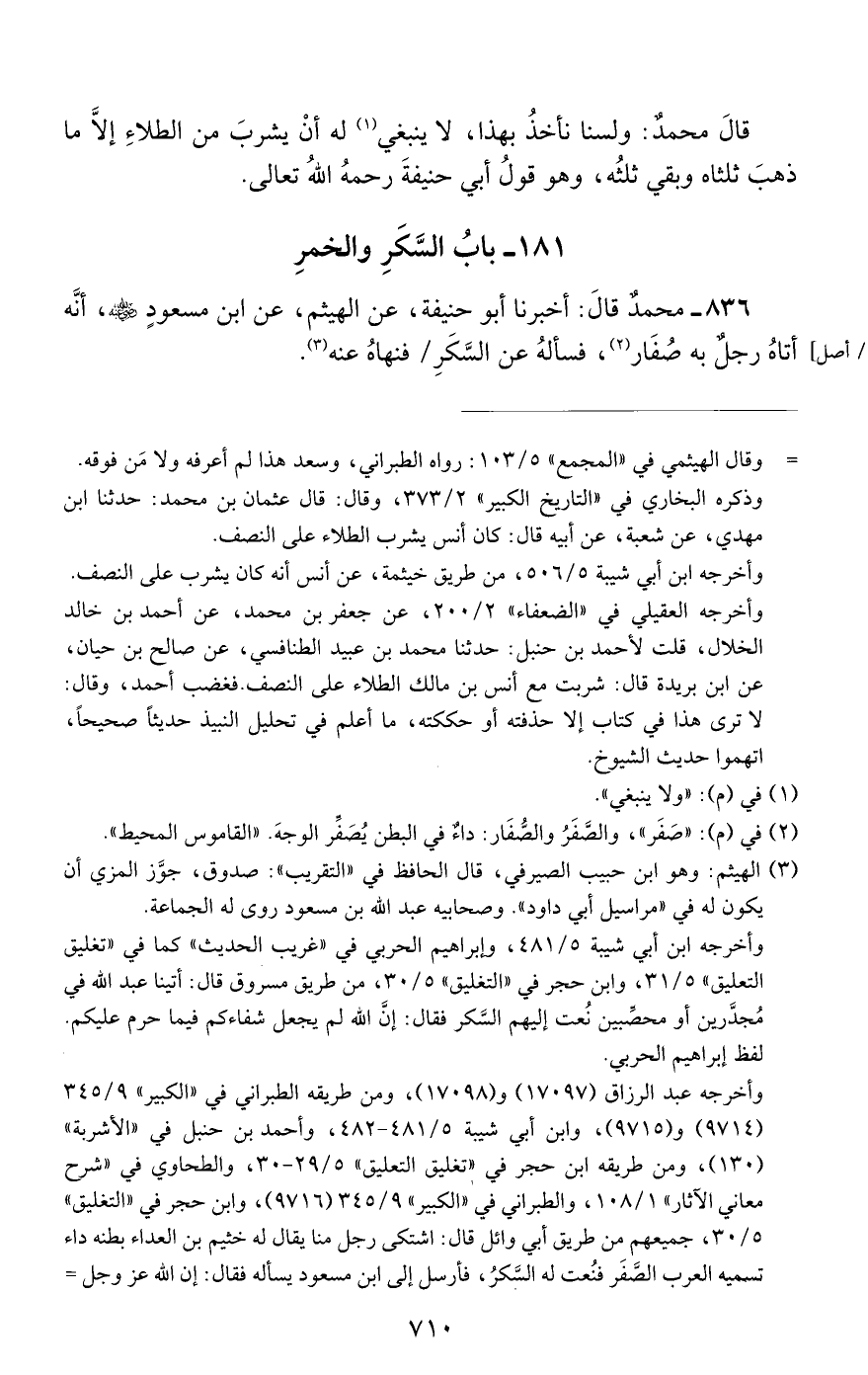 836 - محمد قال: أخبرنا أبو حنيفة, عن الهيثم, عن ابن مسعود رضي الله عنه, أنه أتاه رجل به صفار, فسأله عن السكر فنهاه عنه.