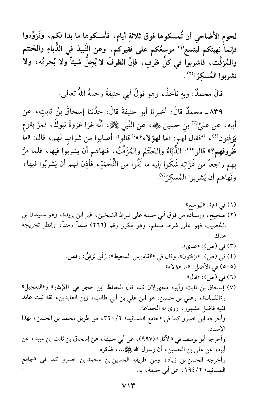 839 - محمد قال: أخبرنا أبو حنيفة قال: حدثنا إسحاق بن ثابت, عن أبيه, عن علي بن حسين رضي الله عنه, عن النبي صلى الله عليه وسلم, أنه غزا غزوة تبوك, فمر بقوم يزفنون, فقال لهم: ما لهؤلاء؟ قالوا: أصابوا من شراب لهم, قال: ما ظروفهم؟ قالوا: الدباء والحنتم والمزفت, فنهاهم أن يشربوا فيها, فلما مر بهم راجعا من غزاته شكوا إليه ما لقوا من التخمة, فأذن لهم أن يشربوا فيها, ونهاهم أن يشربوا المسكر.