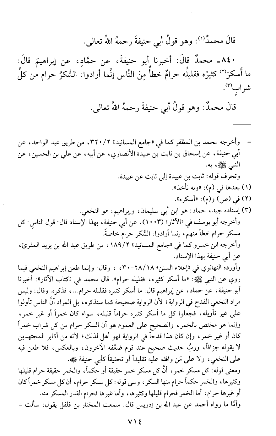 840 - محمد قال: أخبرنا أبو حنيفة, عن حماد, عن إبراهيم قال: ما أسكر كثيره فقليله حرام خطأ من الناس إنما أرادوا: السكر حرام من كل شراب.