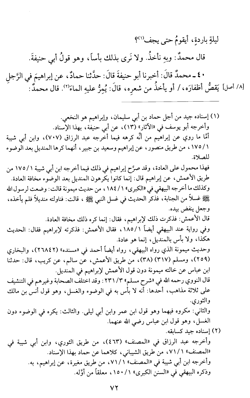 40 - مُحَمَّدٌ، قَالَ: أَخْبَرَنَا أَبُو حَنِيفَةَ، قَالَ: حَدَّثَنَا حَمَّادٌ، عَنْ إِبْرَاهِيمَ فِي الرَّجُلِ يَقُصُّ أَظْفَارَهُ أَوْ يَأْخُذُ مِنْ شَعْرِهِ، قَالَ: «يَمُرُّ عَلَيْهِ الْمَاءُ»