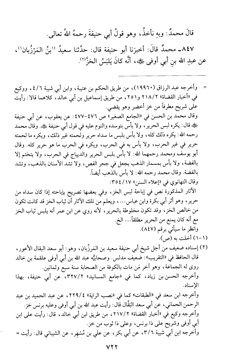 847 - محمد قال: أخبرنا أبو حنيفة قال: حدثنا سعيد بن المرزبان عن عبد الله بن أبي أوفى رضي الله عنه, أنه كان يلبس الخز.