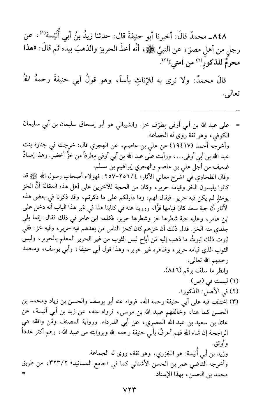 848 - محمد قال: أخبرنا أبو حنيفة قال: حدثنا زيد بن أبي أنيسة, عن رجل من أهل مصر, عن النبي صلى الله عليه وسلم, أنه أخذ الحرير والذهب بيده ثم قال: هذا محرم للذكور من أمتي.