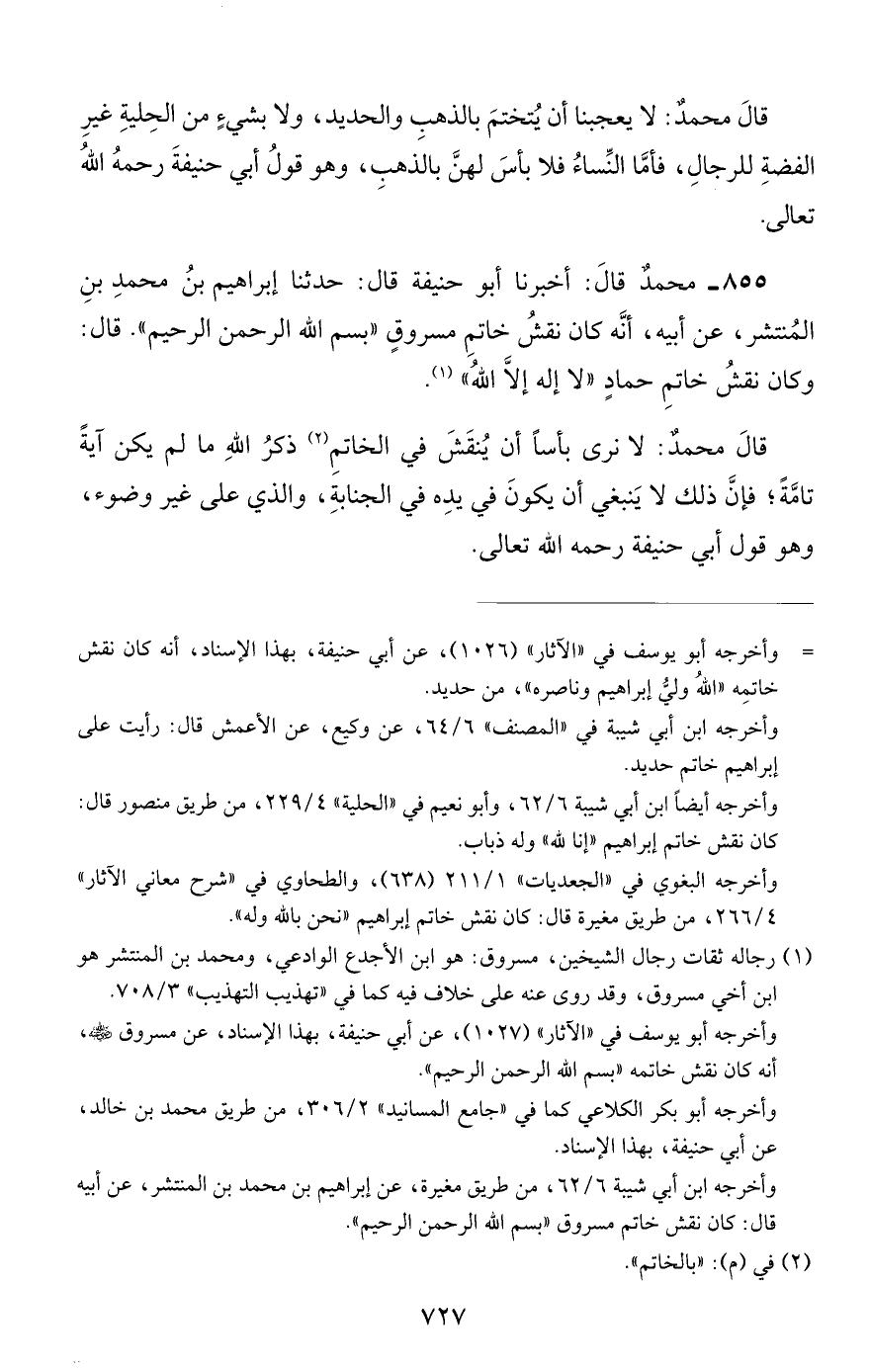 855 - محمد قال: أخبرنا أبو حنيفة قال: حدثنا إبراهيم بن محمد بن المنتشر, عن أبيه, أنه كان نقش خاتم مسروق بسم الله الرحمن الرحيم. قال: وكان نقش خاتم حماد لا إله إلا الله.