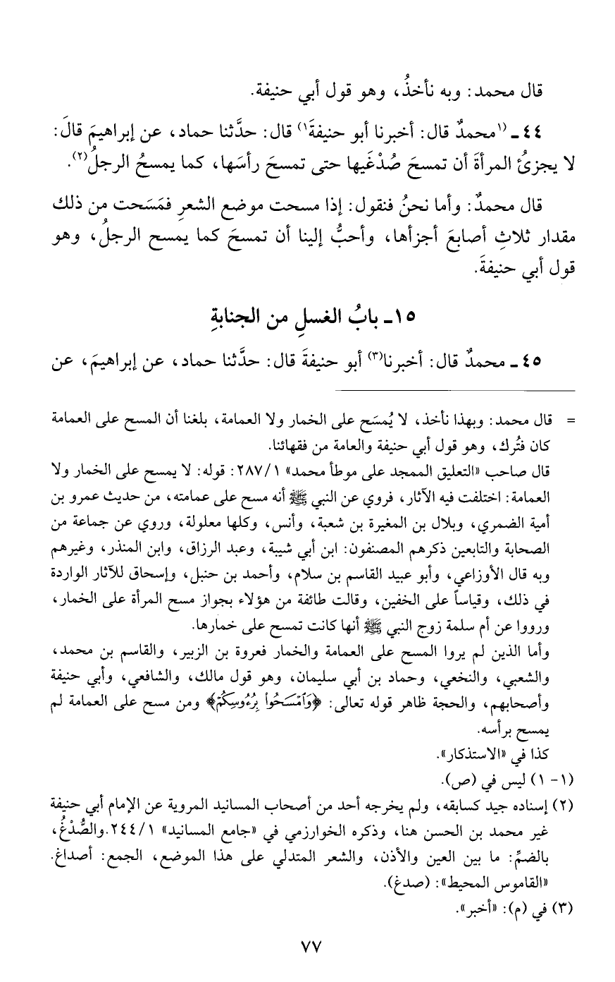 44 - مُحَمَّدٌ، قَالَ: أَخْبَرَنَا أَبُو حَنِيفَةَ، قَالَ حَدَّثَنَا حَمَّادٌ، عَنْ إِبْرَاهِيمَ، قَالَ: لَا يُجْزِئُ الْمَرْأَةَ أَنْ تَمْسَحَ صُدْغَيْهَا حَتَّى تَمْسَحَ رَأْسَهَا كَمَا يَمْسَحُ الرَّجُلُ " قَالَ مُحَمَّدٌ: وَأَمَّا نَحْنُ فَنَقُولُ: إِذَا مَسَحَتْ مَوْضِعَ الشَّعْرِ فَمَسَحَتْ مِنْ ذَلِكَ مِقْدَارَ ثَلَاثِ أَصَابِعَ أَجْزَأَهَا وَأَحَبُّ إِلَيْنَا أَنْ تَمْسَحَ كَمَا يَمْسَحَ الرَّجُلُ، وَهُوَ قَوْلُ أَبِي حَنِيفَةَ