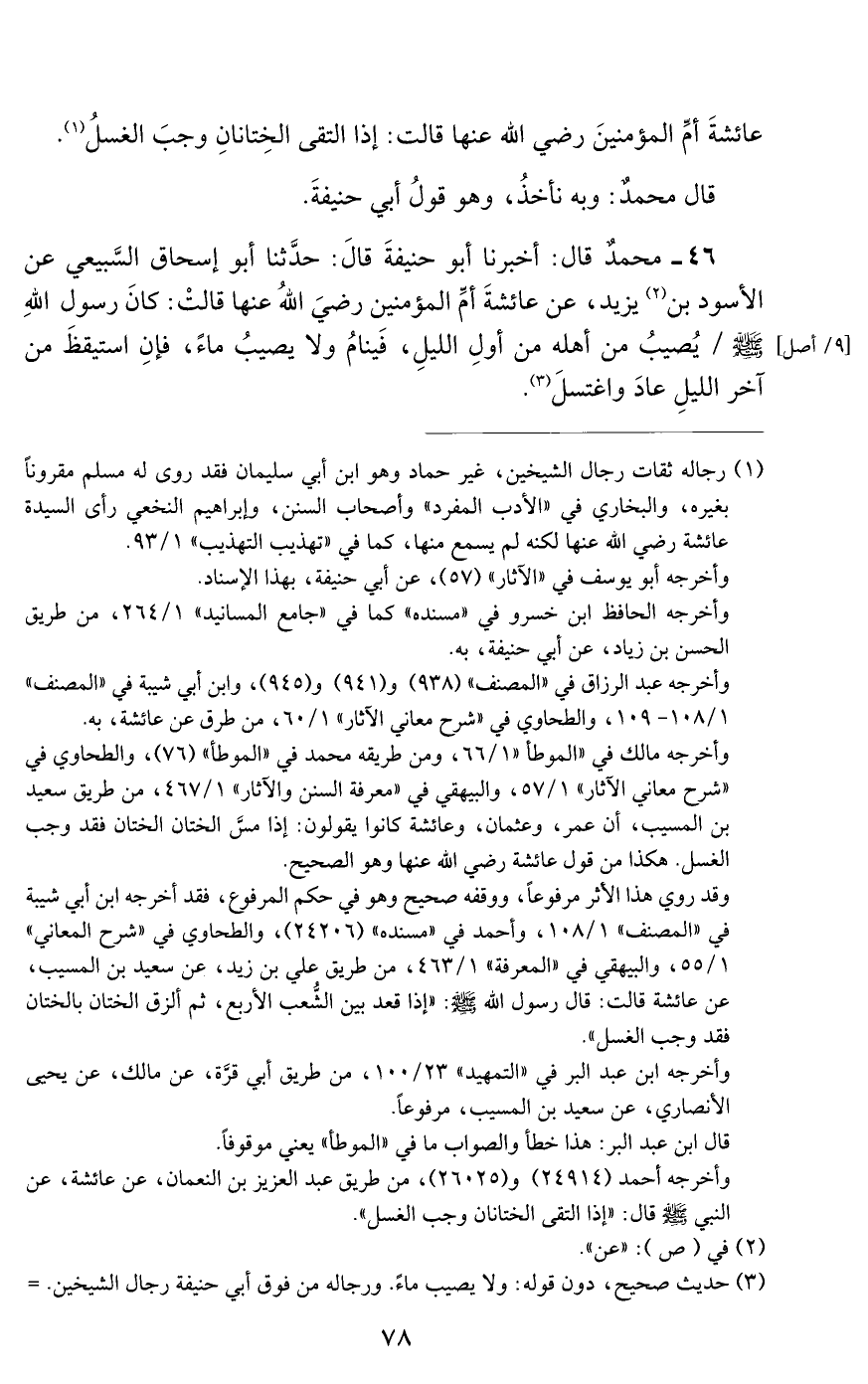 46 - مُحَمَّدٌ، قَالَ: أَخْبَرَنَا أَبُو حَنِيفَةَ، قَالَ حَدَّثَنَا أَبُو إِسْحَاقَ السَّبِيعِيُّ، عَنِ الْأَسْوَدِ بْنِ يَزِيدَ، عَنْ عَائِشَةَ أُمِّ الْمُؤْمِنِينَ رَضِيَ اللَّهُ عَنْهَا، قَالَتْ: كَانَ رَسُولُ اللَّهِ صَلَّى اللهُ عَلَيْهِ وَسَلَّمَ يُصِيبُ مِنْ أَهْلِهِ مِنْ أَوَّلِ اللَّيْلِ، فَيَنَامُ، وَلَا يُصِيبُ مَاءً، فَإِنِ اسْتَيْقَظَ مِنْ آخِرِ اللَّيْلِ عَادَ وَاغْتَسَلَ "