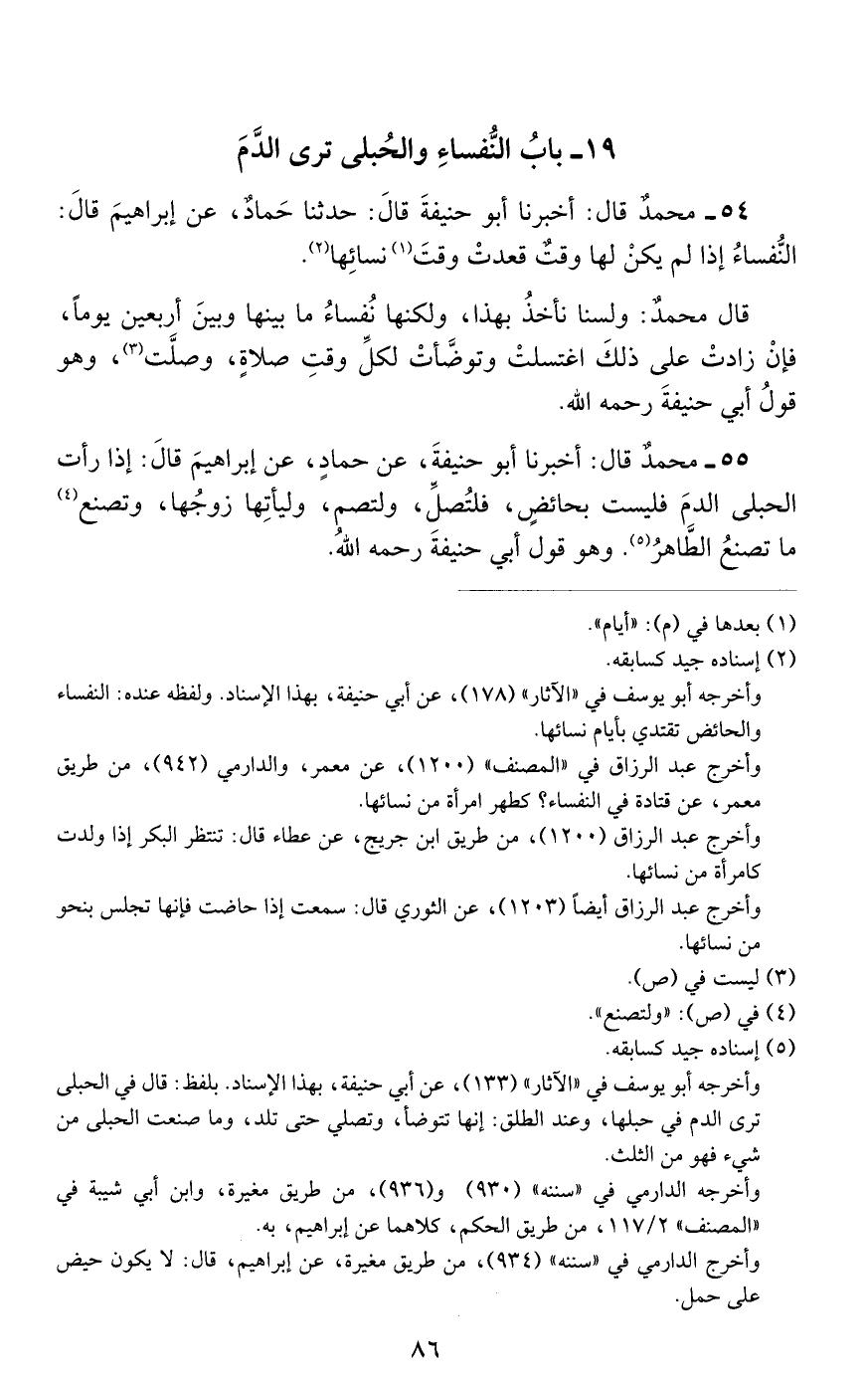 54 - مُحَمَّدٌ، قَالَ: أَخْبَرَنَا أَبُو حَنِيفَةَ، قَالَ حَدَّثَنَا حَمَّادٌ، عَنْ إِبْرَاهِيمَ، قَالَ: «النُّفَسَاءُ إِذَا لَمْ يَكُنْ لَهَا وَقْتٌ قَعَدَتْ وَقْتَ نِسَائِهَا»