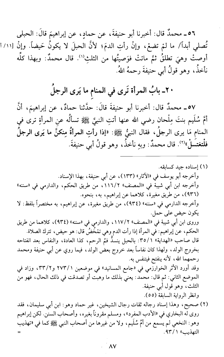 57 - مُحَمَّدٌ، قَالَ: أَخْبَرَنَا أَبُو حَنِيفَةَ، قَالَ حَدَّثَنَا حَمَّادٌ، عَنْ إِبْرَاهِيمَ، أَنَّ أُمَّ سُلَيْمٍ بِنْتَ مِلْحَانَ رَضِيَ اللَّهُ عَنْهَا أَتَتِ النَّبِيَّ صَلَّى اللهُ عَلَيْهِ وَسَلَّمَ تَسْأَلُهُ عَنِ الْمَرْأَةِ تَرَى فِي الْمَنَامِ مَا يَرَى الرَّجُلُ، فَقَالَ النَّبِيُّ صَلَّى اللهُ عَلَيْهِ وَسَلَّمَ: «إِذَا رَأَتِ الْمَرْأَةُ مِنْكُنَّ مَا يَرَى الرَّجُلُ فَلْتَغْتَسِلْ»