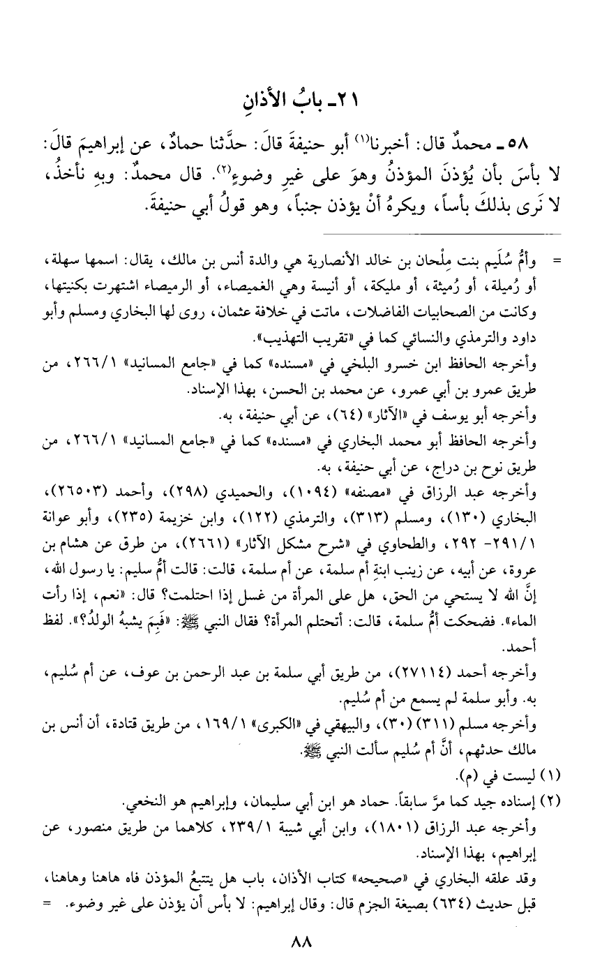 58 - مُحَمَّدٌ، قَالَ: أَخْبَرَنَا أَبُو حَنِيفَةَ، قَالَ حَدَّثَنَا حَمَّادٌ، عَنْ إِبْرَاهِيمَ، قَالَ: «لَا بَأْسَ بِأَنْ يُؤَذِّنَ المُؤَذِّن، وَهُوَ عَلَى غَيْرِ وُضُوءٍ»