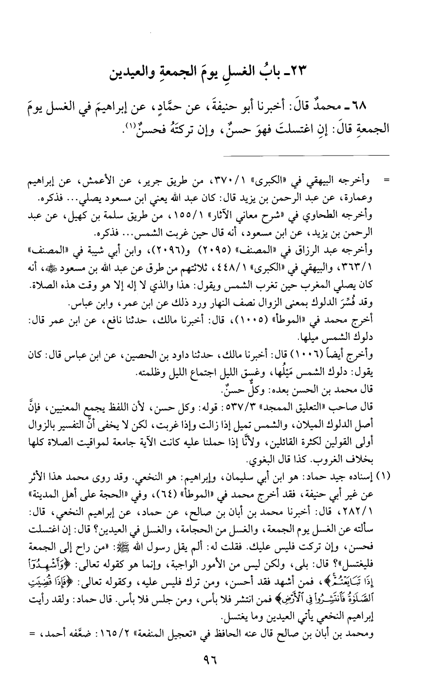 68 - مُحَمَّدٌ، قَالَ: أَخْبَرَنَا أَبُو حَنِيفَةَ، عَنْ حَمَّادٍ، عَنْ إِبْرَاهِيمَ " فِي الْغُسْلِ يَوْمَ الْجُمُعَةِ قَالَ: «إِنِ اغْتَسَلْتَ، فَهو حَسَنٌ، وَإِنْ تَرَكْتَهُ فَحَسَنٌ»