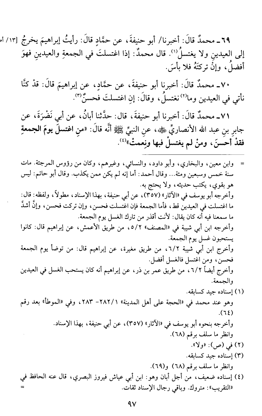 69 - مُحَمَّدٌ، قَالَ: أَخْبَرَنَا أَبُو حَنِيفَةَ، عَنْ حَمَّادٍ، قَالَ: رَأَيْتُ إِبْرَاهِيمَ يَخْرُجُ إِلَى الْعِيدَيْنِ وَلَا يَغْتَسِلُ "